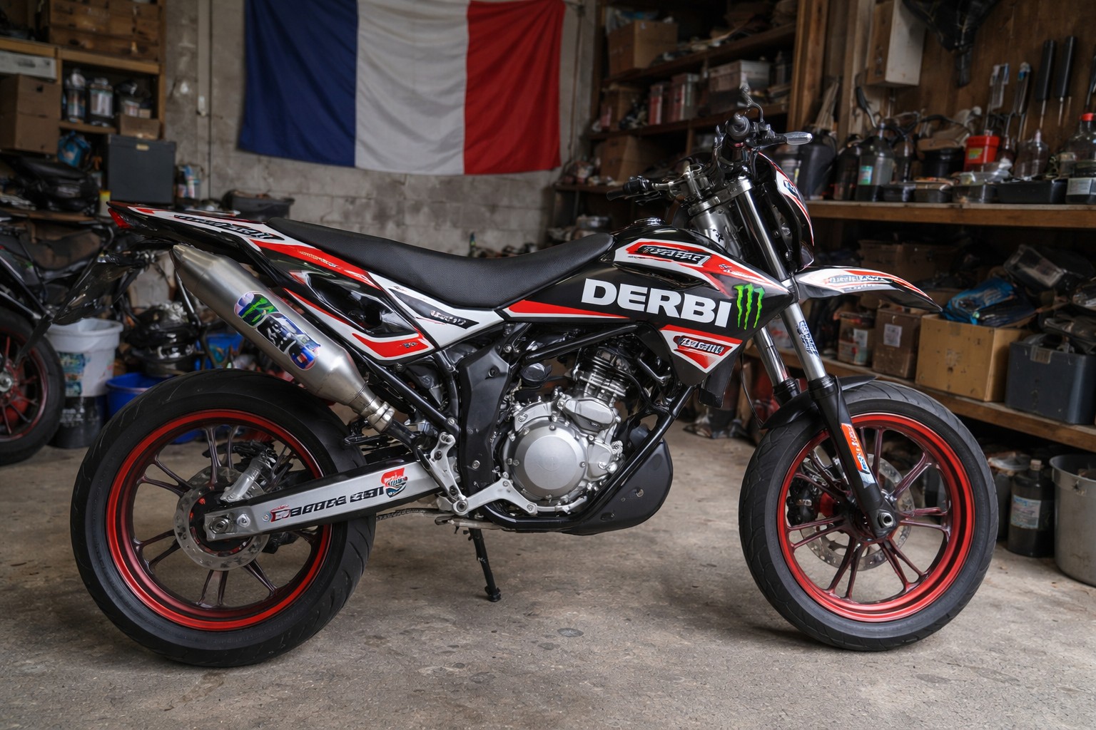 Photo d’une Sherco 50cc équipée d’un kit déco personnalisé bleu, orange et blanc, prise en vue latérale dans un garage, avec carénage custom, jantes noires, selle noire et échappement apparent, style photo réaliste Panasonic GH4